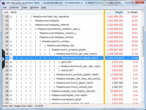 いい加減なんとかするか。300文字くらい日本語を書くと、Meadowが露骨に遅くなって、1000文字超えるともはや編集不可能という状態だった。 しかもなんかカーネル空間で時間食ってるっぽくて謎い。 xperf xperf素晴らしいのでみんな使うべき。Windows SDKを入…